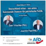 🇩🇪Deutschland retten – von unten. Kommunale Chancen für patriotische Politik.🇩🇪 Die AfD-Fraktion im Rat der Stadt Geilenkirchen lädt zum 1. Bürgerdialog zum oben genannten Thema am: 🗓️ 12. Dezember 2025 🕖 19:00 Uhr 📍Haus Basten Konrad-Adenauer-Straße 120 52511 Geilenkirchen Eingang Friedlandplatz ein. Mit dabei sind: 🗣️ Sven Tritschler (MdL NRW) Sven Tritschler, der energische AfD-Landtagsabgeordnete und stellvertretende…